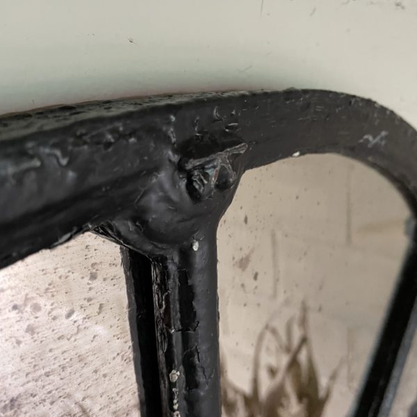Beautiful Full Arched Decorative Mirror. Aged black tones with preserved original feature rose detail. A very attractive piece with good dimensions for many locations. An English heritage piece reclaimed from an Orangery in Hampshire. Each of the 14 inner panels are completed with our hand antiqued mirror, adding further traditional detail and interest to this mirror. Restored suitable for home and garden display. Supplied with its own bespoke wall fixings for flush wall mounting at a position of choice. A one off restoration from Aldgate Home