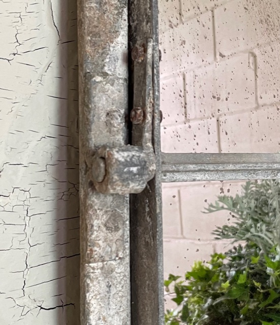 Industrial detail on a beautiful soft design mirrors, that have a very cute appeal. Reclaimed from Belgium these delightful pieces have great industrial detail with original rivet and hinge features. Soft aged tones of greys complete these Slow Arch finds. Restored suitable for home and garden display. Smaller in size so very suitable to fit most locations. Perfect over mantle, over furniture or for a super feature on a garden walled area. Foliage grown around our mirrors in an garden scene always works so well. They can be offered with plain or our hand antqiued mirror. Our hand antqiued mirror bringing further softness and warmth to these pieces.