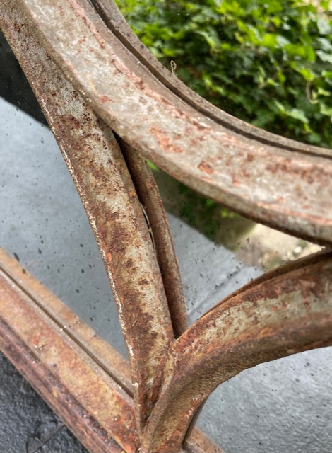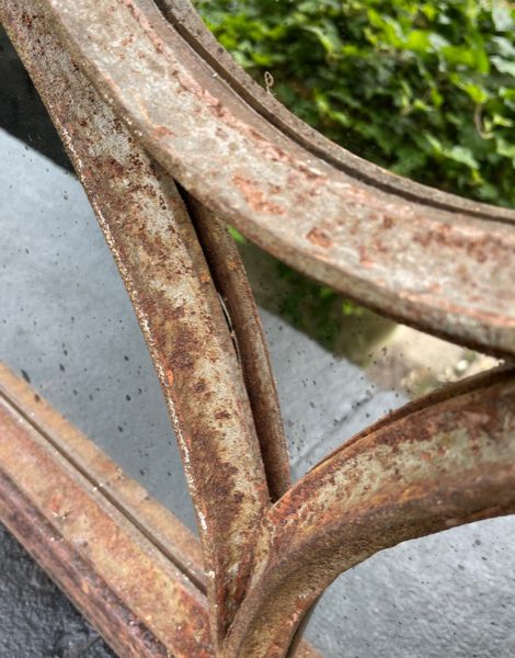A Unique Aldgate Home Decorative Architectural Mirror. This very beautiful and totally unique mirror has a very appealing inner panel design, which will offer the most interesting feature in a home or garden location. Original flanged surround with rivet detail and 3 inner circles set amongst elegant lines of profiled ironwork. We are not sure where this originated, possibly over a doorway or as a window. It is believed to be of English heritage. The aged tones are a gorgeous mix of rustic and grey and totally complete the elegance and softness of this piece. Each inner panel has been completed with our hand antiqued mirror adding further complementing feature. We have not sourced a piece close to this design before. A total one off from the Aldgate Home collection. Supplied with all wall fixings for flush wall mounting